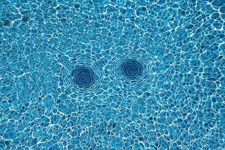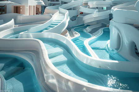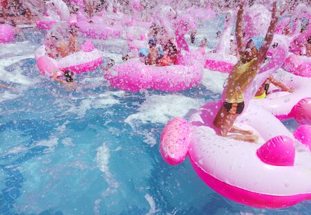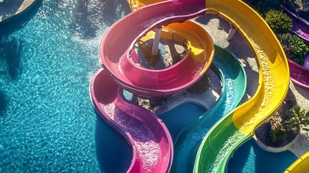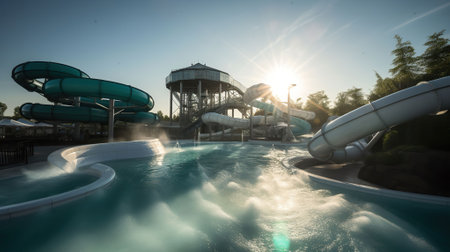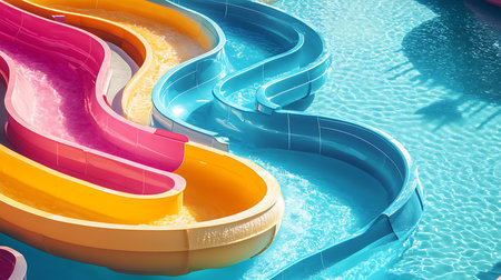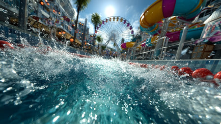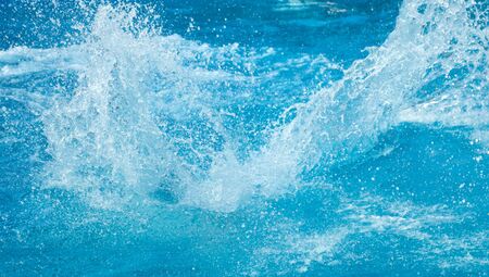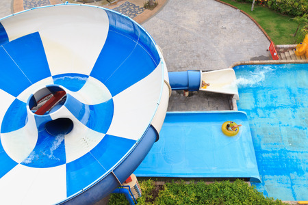 Water entering swimming pool from aqua park slide creating splash motion abstract effect