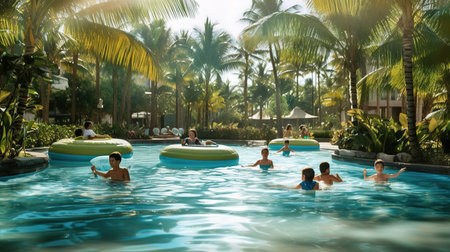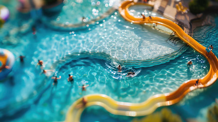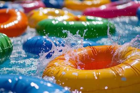 Vibrant inflatable toys splashing in a pool, perfect summer scene with ample copy space