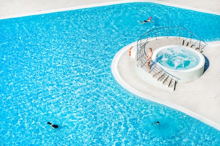 Big beautiful outdoor water pool in unknown hotel or aquapark with round hydro-massage bath