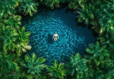 Aerial view palms and water pool. Summer holiday in Antalya, Turkey. Tropical landscape with palm trees blue water. Top view