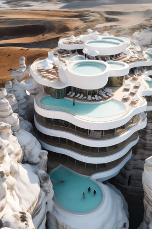 Aerial view of luxury hotel swimming pool in Dubai, United Arab Emirates