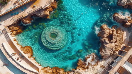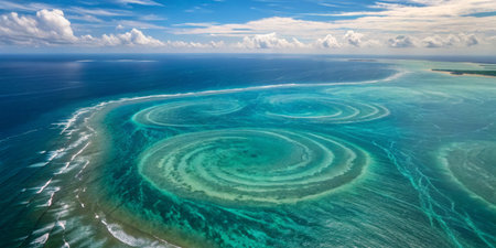 Turquoise waters display mesmerizing spiral patterns formed by ocean currents near a tropical coastline. The bright sky enhances the vivid colors of this coastal landscape.
