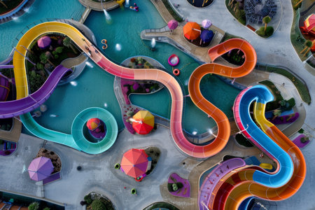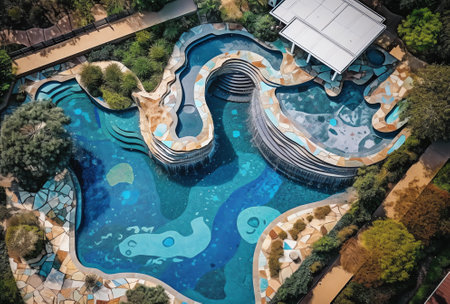 Aerial photography aquapark of Torrevieja resort city. Directly above view of waterpark slides shapes and lush tropical plants. Costa Blanca, Alicante province. Spain