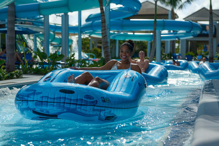 Orlando, Florida. July 01, 2019. Mother and kids enjoying water fall on lazy river at Aquatica.