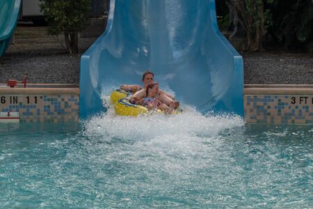 Orlando, Florida. April 07, 2019. People enjoying Taumata Racer. It is the biggest thrill in the park, at Aquatica.