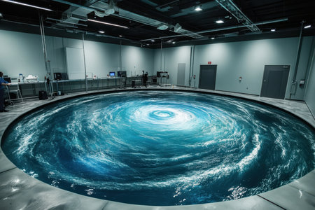 Scientists monitor water movement in a laboratory, studying swirling patterns for research purposes.