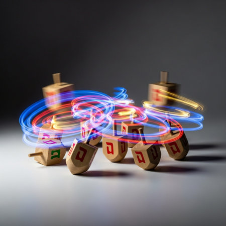 A vibrant spinning top twirls energetically on a sunlit wooden floor, casting playful shadows. Dust particles gently float in the warm light, adding to the nostalgic scene of childhood joy.