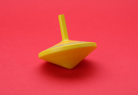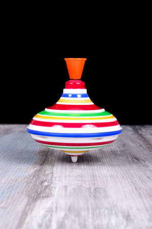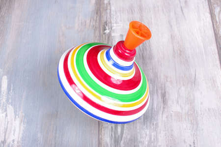 Plastic spinning top toy isolated on the reclaimed oak surface