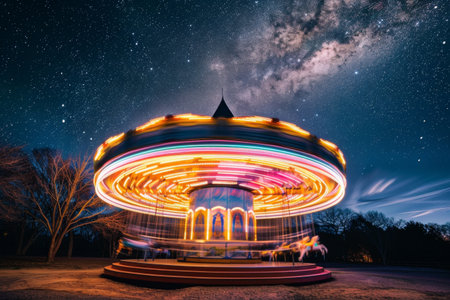 Vivid carousel in motion creates a playful blur of colors at night carnival