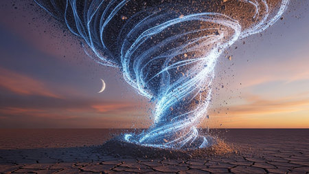 A vibrant blue and white glowing tornado of light and debris swirls in a cracked desert landscape under a twilight sky with a crescent moon.