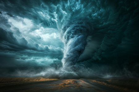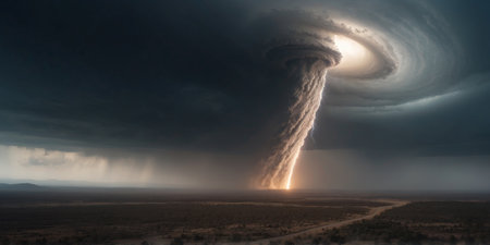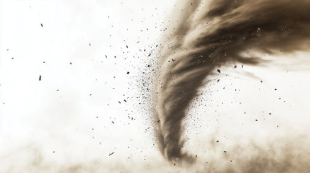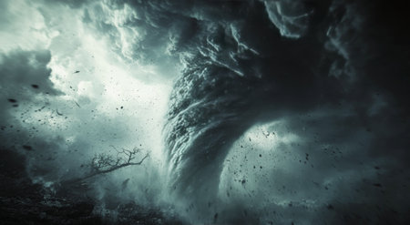 A powerful tornado twisting through a rural landscape, with dark, ominous clouds and debris being lifted into the air, illustrating the destructive force of the storm.