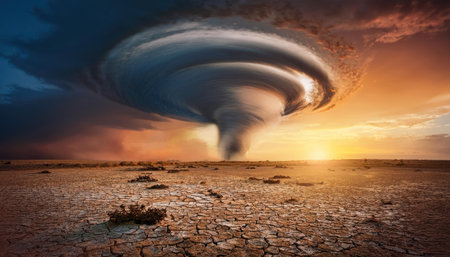 Conceptual image of tornado over dry land. Dramatic sky.