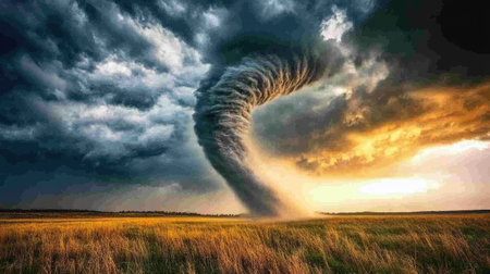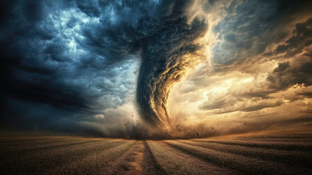 A captivating scene shows a dramatic tornado twisting over golden fields as dark clouds loom above, creating an intense and breathtaking atmosphere at dusk.