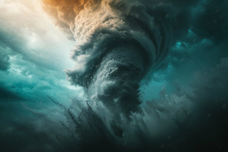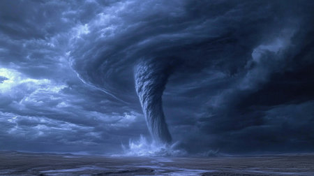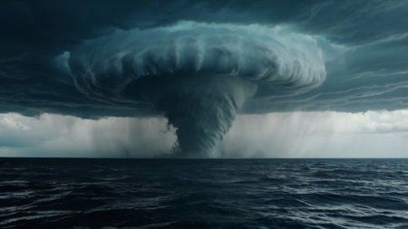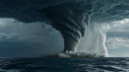 A striking illustration of a tornado forming over a turbulent sea under a dramatic sky. The image captures the intensity of nature's power, showcasing swirling clouds and lightning, creating a captivating atmosphere that highlights the beauty and danger of storms.