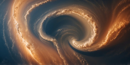Aerial view of swirling hurricane clouds at sunset, dramatic natural phenomenon. Weather and climate concept