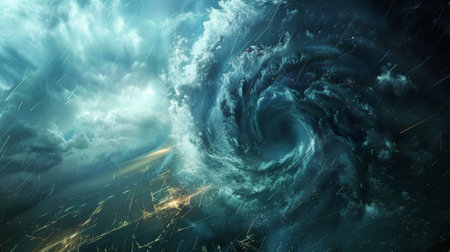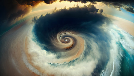 Dramatic aerial view of powerful ocean hurricane with swirling vortex energy dynamic force.
