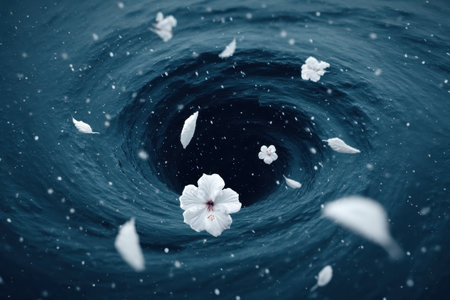 A captivating digital artwork depicting a swirling vortex filled with delicate petals, creating a serene and surreal atmosphere that evokes nature's beauty and fluid motion.