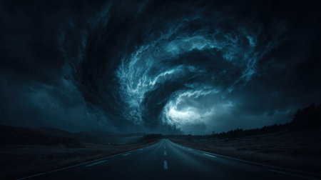 A dramatic scene depicting swirling dark clouds above an empty road, representing the awe-inspiring power of nature and its atmospheric beauty.