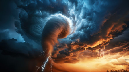 This stunning image captures the awe-inspiring beauty of a supercell thunderstorm with a swirling vortex, showcasing intense weather dynamics and a dramatic sunset backdrop.