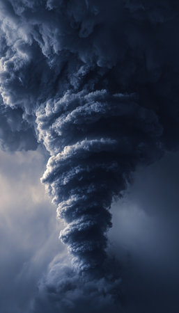 A powerful tornado vortex made of thick gray smoke twists upward against a stormy gradient background. This dramatic abstraction is ideal for conceptual posters or scientific themes.