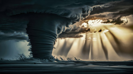 A tornado is seen in the sky with a bright sun shining through, AI