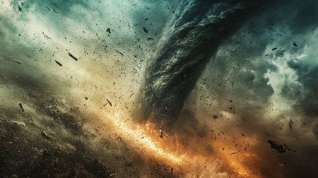 A powerful tornado wreaks havoc in an urban environment, with debris flying and fiery explosions illuminating the stormy sky. Nature's fury captured in a dramatic moment.