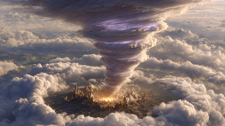 An aerial view shows a massive tornado descending over an urban landscape. The swirling vortex is filled with dark and light hues, contrasting with the bright, puffy clouds. The scene is illuminated by sunlight, highlighting the city below. Suitable for illustrating weather events or environmental themes.