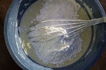 Mixing ingredients for making cake. Close-up of a mixing bowl with dough and whisk.