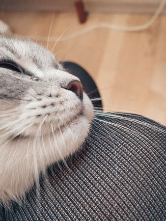 Mosquitoes on the cat's nose. Grey cats are sleepy. Copy space for text.