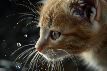 A kitten with a wet nose and a wet face. The kitten is looking at the camera. The image has a playful and curious mood