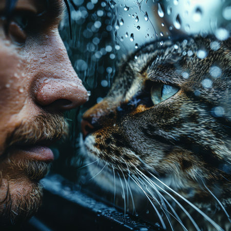 A man with a beard is looking at a cat through a window. The cat is on the other side of the glass, and both the man and the cat are in focus. The background is a blur of rain.