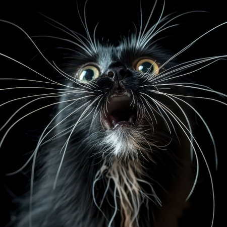 A black cat is captured mid-reaction, showcasing its wide eyes and open mouth, highlighting its long whiskers and expressive fur against a dark background.