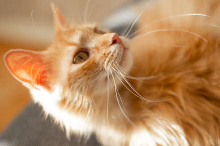 A fluffy cat gazes upward with its mouth slightly open showcasing its soft fur and whiskers in an indoor space with neutral lighting.