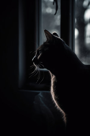 Silhouette of a cat looking out the window at night, animal silhouette photorealistic poster.