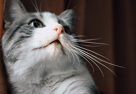 Beautiful bicolor white gray cat with long white mustache, pink nose, green eyes. Portrait of a fluffy kitty looking dreamily up. Feline pet animal on brown background. cuteness. selective focus.
