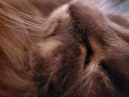 Macro zoom soft a bit blur on cat face at its nose and mouth while sleeping, for background of fur texture of cute animal - Vertical image