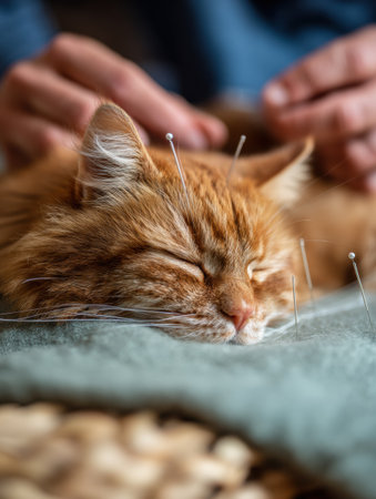 A cozy setting features a cat relaxing while undergoing acupuncture, demonstrating the benefits of alternative therapy at a holistic veterinary practice.