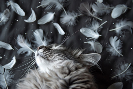 Cat and feathers are falling around. Animal, pet, kitten or catlike, felino
