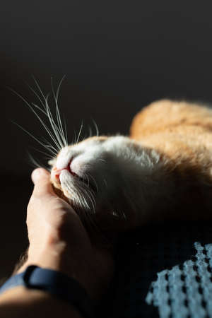The owner pets a red cat lying in the sun on a blue blanket. Front view.