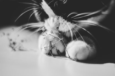 black and white photo in which a black cat with white paws chews on a summer flower.