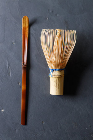 Closeup of Chasen or Bamboo whisk and Chashaku or tea scoop, equipments for preparing matcha green tea. Selective focus.