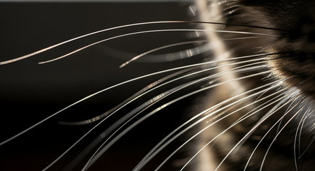 An artistic extreme macro photograph captures the delicate and sensitive whiskers of a cat, beautifully backlit against a dark background. The fine, white hairs curve gracefully, with the light catching their edges and creating a striking, high-contrast abstract image. The shot highlights the intricate and often-overlooked details of an animal.
