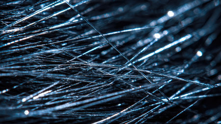 This image presents a captivating close-up of shimmering metallic blue fiber strands, creating a mesmerizing abstract background texture suitable for various design projects.