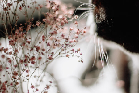 black cat with a white neck close-up with an open mouth eats pink summer flowers lying on a white table.