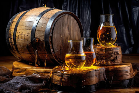 Glass of whiskey on a barrel in a dimly lit cellar. Beverage and craftsmanship concept