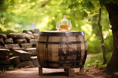 rustic whisky barrel on a wooden table outdoors, created with generative ai