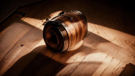 This close-up image showcases the intricate details of a wooden barrel, focusing on its metal bands and weathered texture, evoking a sense of craftsmanship.