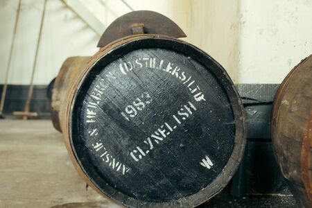 Brora, Scotland / March 22 2018 - Whisky cask in a filling store in Brora distillery, Scotland, UK. Brora distillery is although known as Clynelish distillery