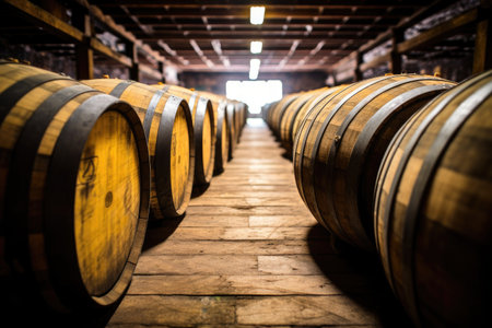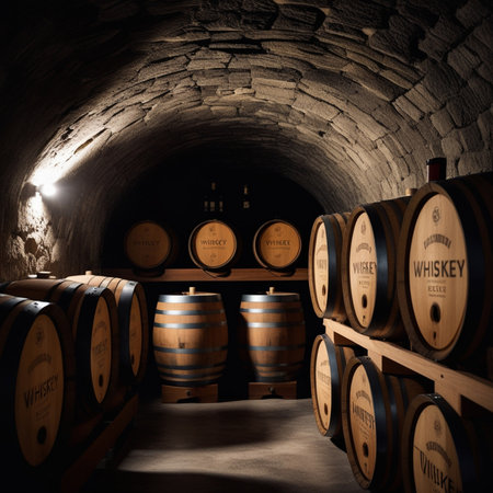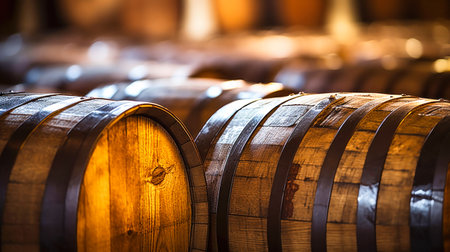 In a rustic warehouse, rows of old wooden whiskey and wine barrels are stacked closely, creating a warm and inviting atmosphere. The soft glow of light illuminates the barrels, highlighting their aged textures and craftsmanship. This setting evokes a sense of tradition and the rich history behind barrel aging.
