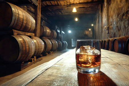 A glass of whiskey on ice sits on a wooden table in a rustic cellar filled with aging barrels, creating a warm, inviting ambiance.